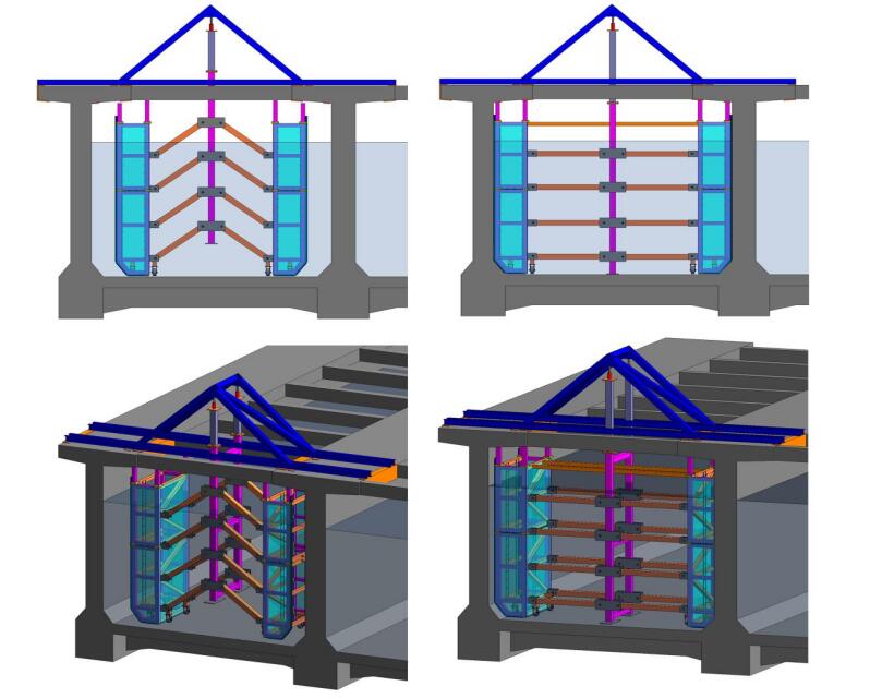 針對大型渡槽結(jié)構(gòu)不中斷輸水施工,巨成結(jié)構(gòu)研究開發(fā)了渡槽施工專用圍堰,通過可伸縮結(jié)構(gòu)將兩側(cè)隔水箱連接,吊裝入水后張開貼緊側(cè)壁,通過高壓水帶形成密封隔水,再兩側(cè)隔水箱內(nèi)水排干,形成干地作業(yè)環(huán)境,由此通過中間過水,兩側(cè)即可進行側(cè)壁修復。對于止水帶修復的情況,可先更換兩側(cè)隔水箱區(qū)域止水帶,再結(jié)合隔水膜將中間區(qū)域隔水,兩側(cè)過水,將中間區(qū)域形成干地作業(yè)環(huán)境。通過底部行走輪和側(cè)面限位輪,可通過牽引系統(tǒng)將隔水裝置在水下進行牽引行走,可做到連續(xù)施工。