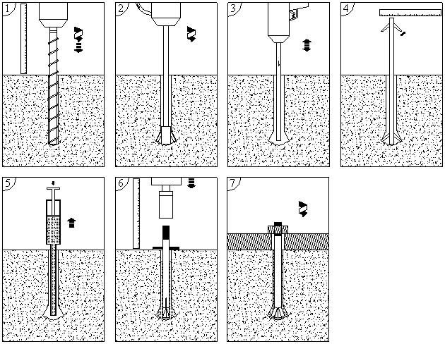 鉆直孔→底部擴(kuò)孔→清孔→測量擴(kuò)孔→注漿→安裝錨桿→連接與安裝