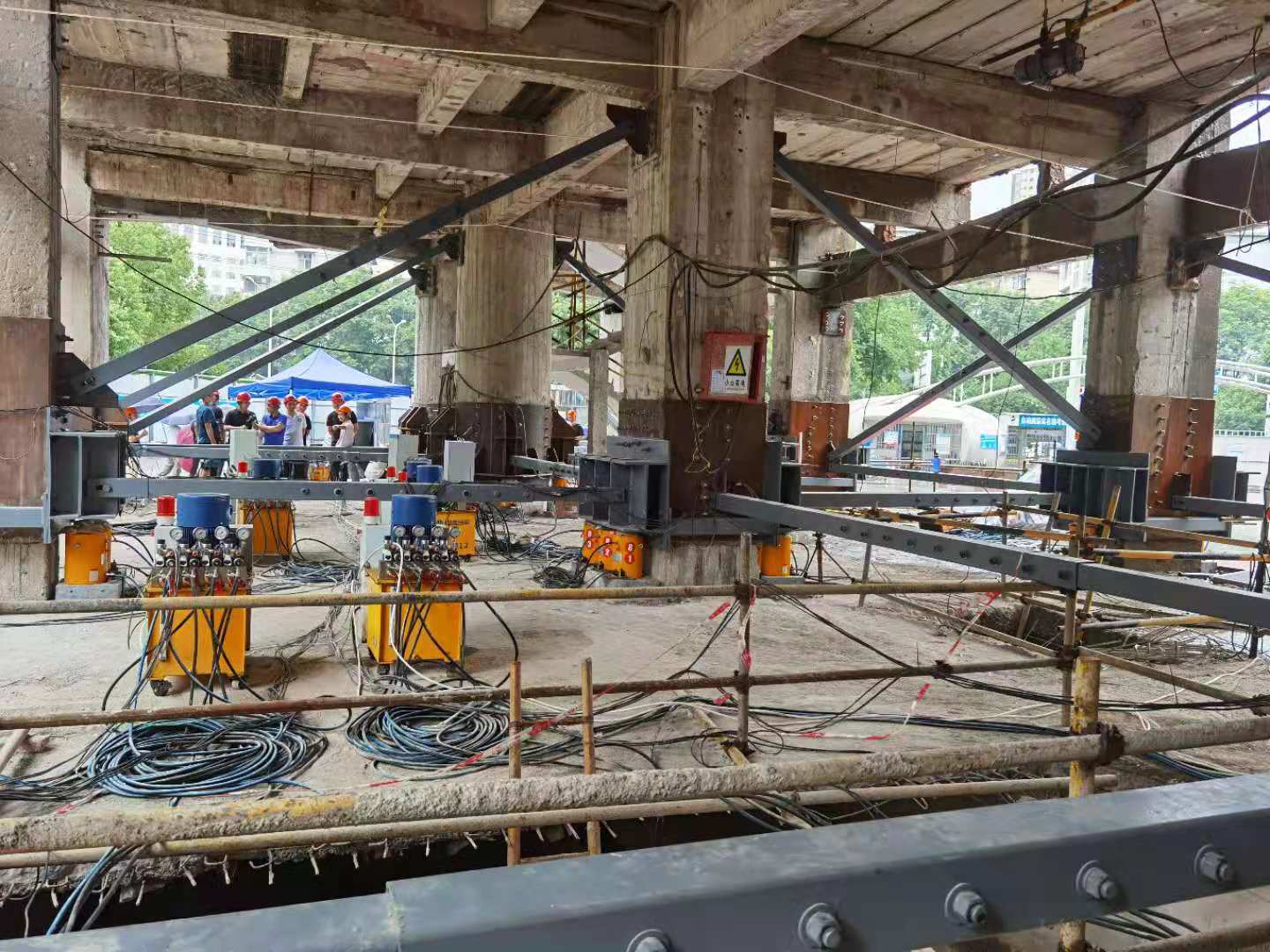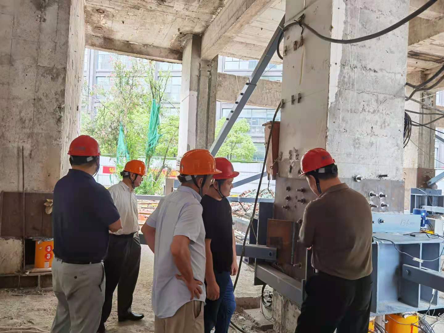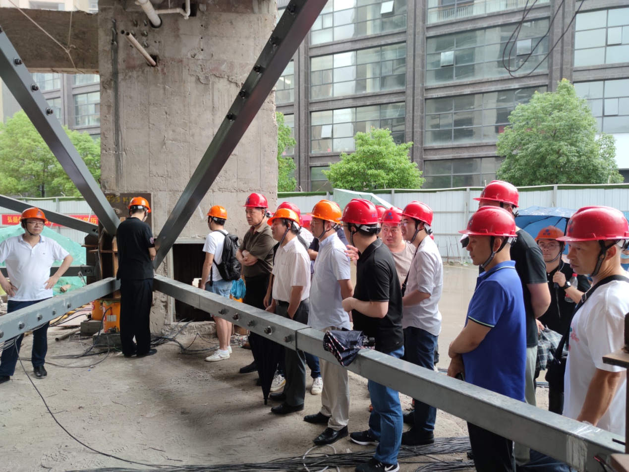 7月2日下午,在董事長(zhǎng)高作平教授的帶領(lǐng)下,公司董事、監(jiān)事、專(zhuān)家、經(jīng)理層等30余人來(lái)到武漢市科技館項(xiàng)目部觀摩指導(dǎo)現(xiàn)場(chǎng)頂升糾偏施工預(yù)頂試驗(yàn)。