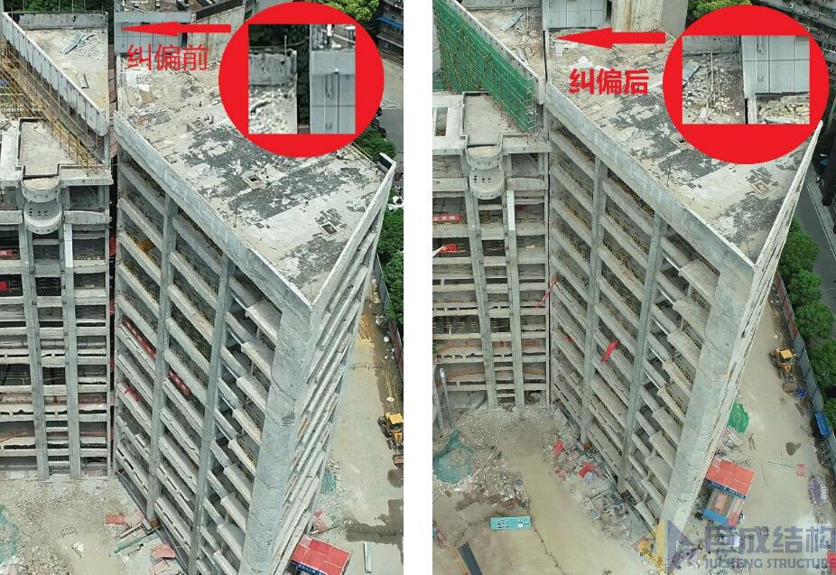 武漢科技館老館1區(qū)東樓頂升糾偏前后對比