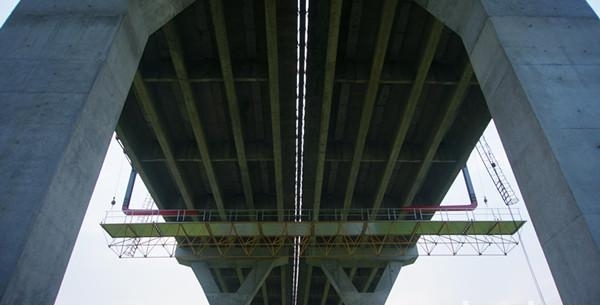 本工程于2007年施工。荊州長江公路大橋1998年3月開建,2002年10月通車,雙塔斜拉橋,主橋段長4178米。經(jīng)過多年運行出現(xiàn)一些病害,巨成2017年承接橋梁維護工程,主要施工內(nèi)容為裂縫處理、支座更換、缺陷修補等。應(yīng)用巨成不封道橋梁檢修架車,不影響交通的情況下完成施工任務(wù),社會經(jīng)濟價值顯著。